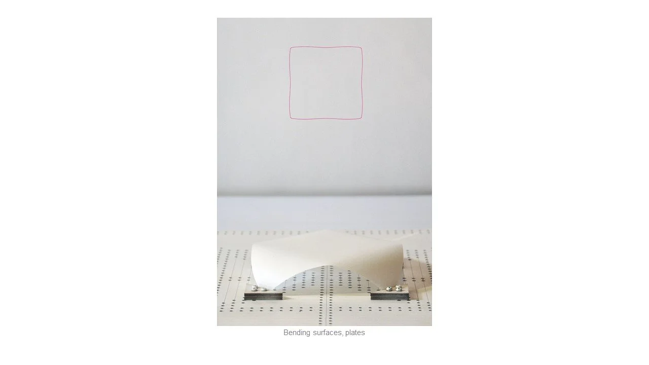 We can start to move from lines to surfaces, Here a set of interconnected guidework study, that when you bend it gives a shape of a vault. By changing the geometry and Behavior of the material we are embedding all structural calculation in a simple everyday tool.